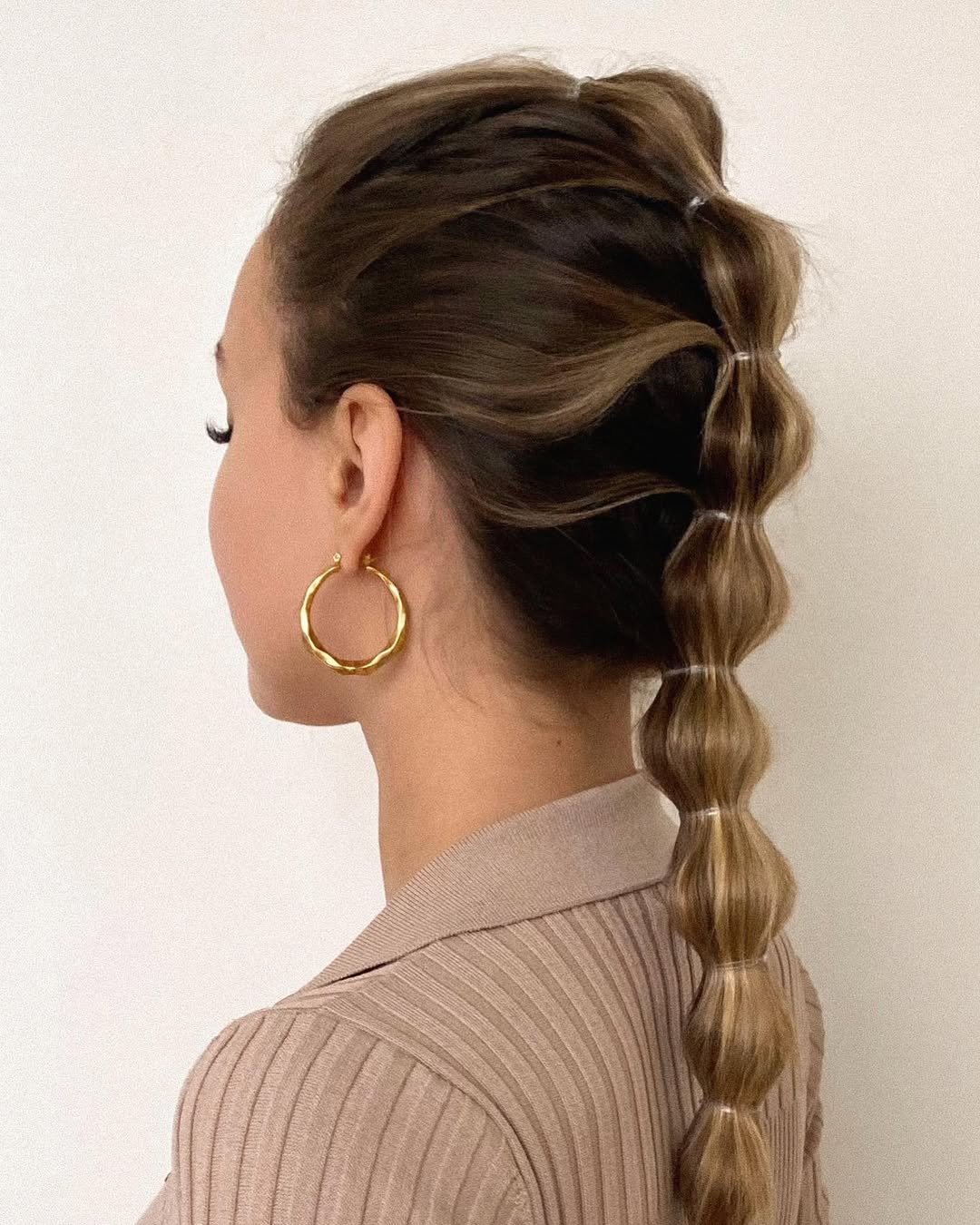 A bubble braid on long hair is absolutely stunning and so much easier than it looks. Put the hair in a ponytail and then add hair ties every few inches down the length of it, gently pulling each section apart to create those full rounded bubbles. The longer the hair the more dramatic and beautiful the effect. It is one of those styles that gets so many compliments for the least amount of effort.