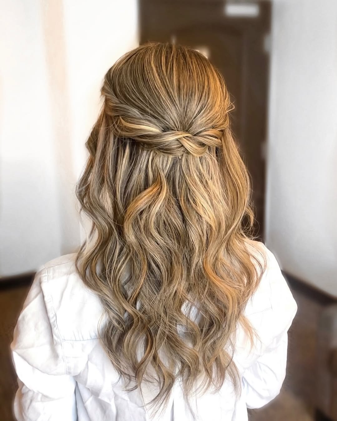 The twisted half up is one of those styles that looks like it requires skill but is actually incredibly simple. Take a section from each side of the front, twist them back toward the center and pin them together at the back. It is romantic, it is pretty and it frames the face in the most flattering way without pulling everything back.