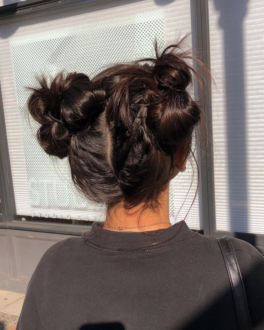 Space buns are not just for little girls and they are definitely not just for special occasions. On long hair they look incredibly fun and cool for an everyday look. Part the hair down the middle, pull each side into a high ponytail, twist into a bun and pin in place. They are playful, they are stylish and they are a great way to switch things up on a regular day.