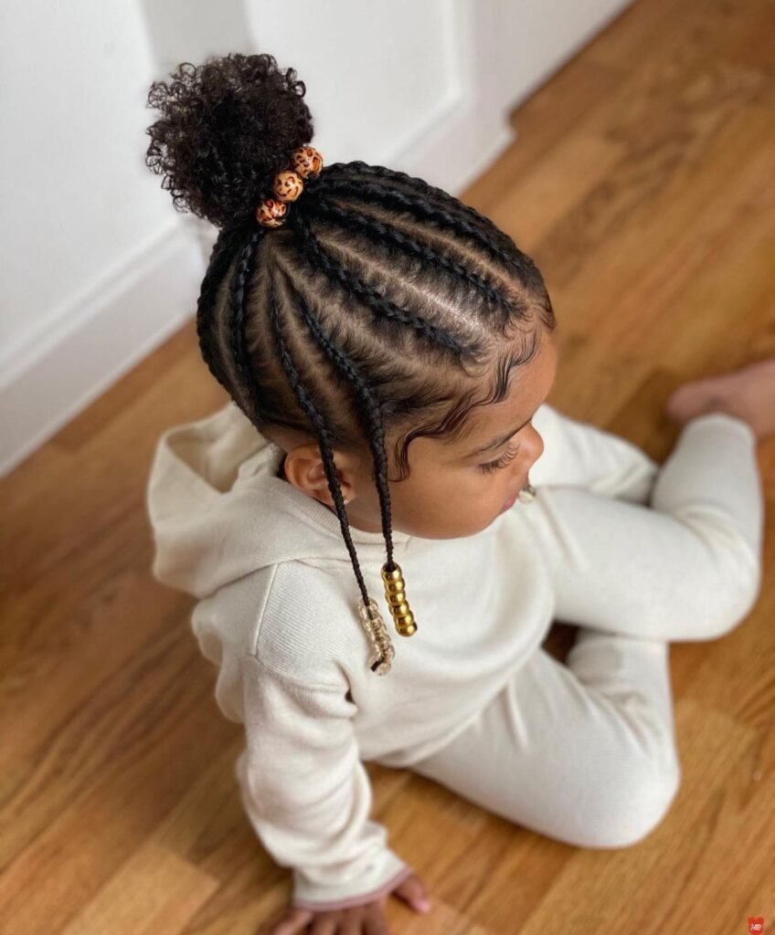 This one is so fun and so practical at the same time. Neat cornrows radiate toward the crown and end in a soft, natural puff that sits beautifully on top of the head. The base of the puff is accented with leopard-print beads, and the front braids fall forward with golden cylindrical beads for that extra regal touch. It is the kind of style that keeps everything secure during recess while still looking absolutely gorgeous. A total playground-to-portrait winner.