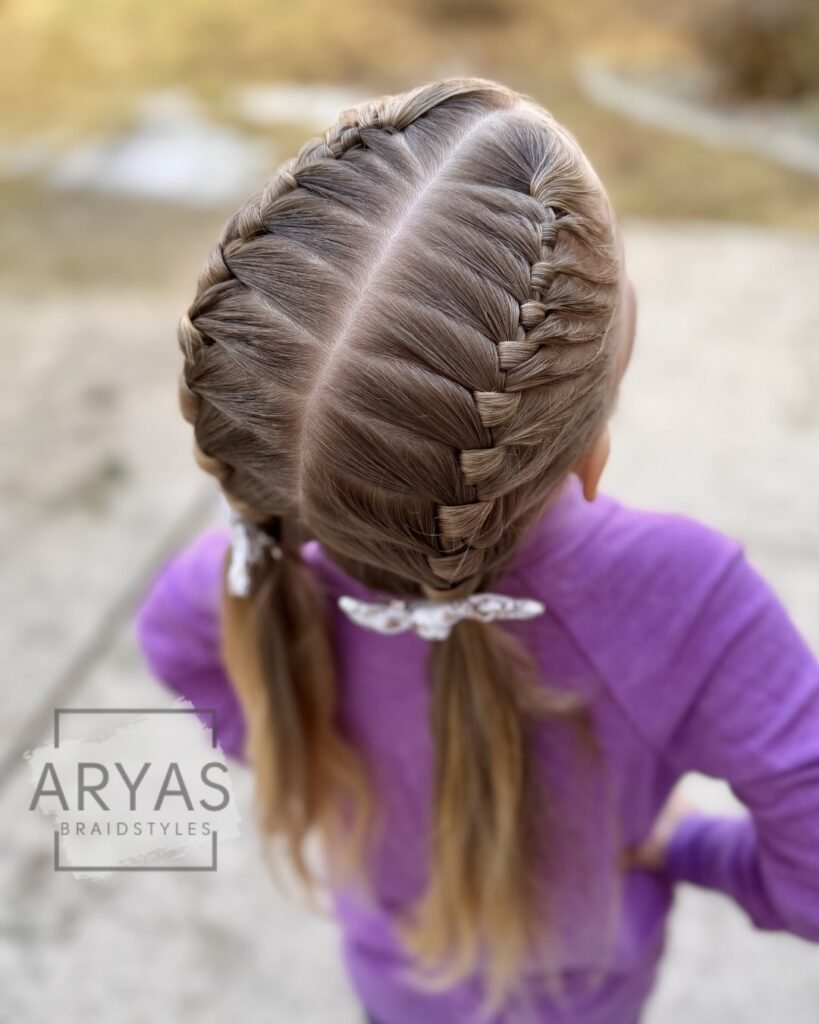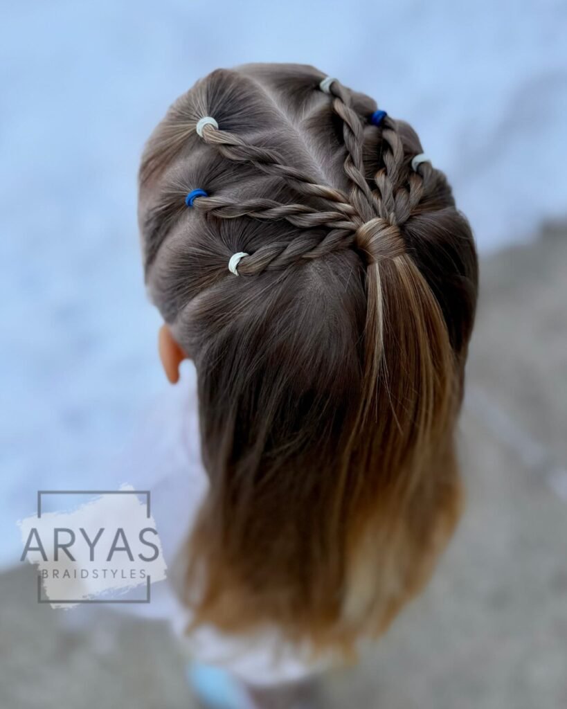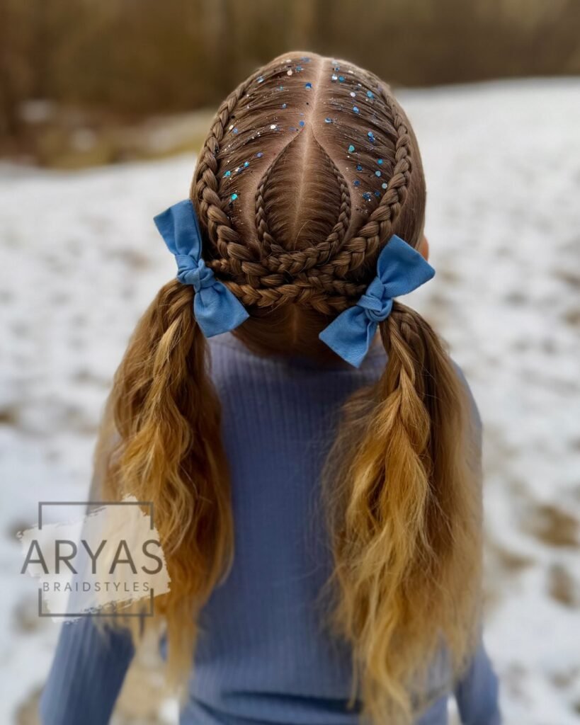 This one is absolutely magical and perfect for the winter months. Two symmetrical braids curve to form a heart shape at the nape of the neck, blue glitter is scattered across the scalp like fallen snow, and dusty-blue denim bows secure wavy pigtails at the ends. It is cozy, it is whimsical, and it feels like a little winter fairytale sitting right on top of your daughter’s head. A truly special style for the colder school days.