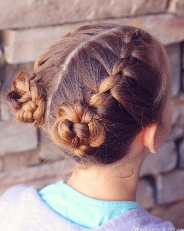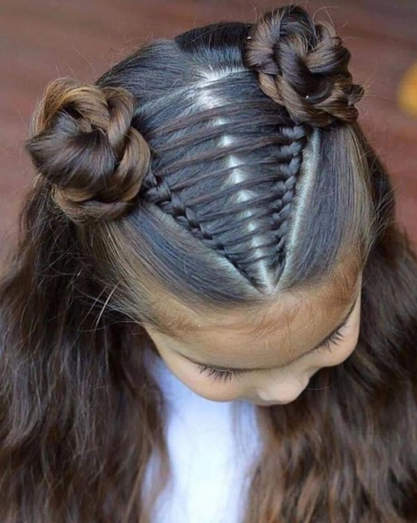 This one is as sturdy as it is sweet. The hair is split into two sections, each braided and then coiled into low, textured buns at the nape that create a beautiful flower petal effect. It is a really secure style that stays polished from the morning drop-off all the way through after-school activities. If your little one is always on the move and you need a style that genuinely stays put all day, this one is a lifesaver.
