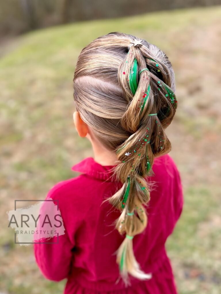This one is pure holiday magic and honestly one of the most joyful styles I have ever seen. A voluminous pull-through braid is woven with vibrant green tinsel and dusted with red and green glitter, pinned with a tiny silver star at the top so the whole braid resembles a decorated Christmas tree. It is festive, it is creative, and it is going to make your daughter the talk of the school during the holiday season. Keep this one bookmarked for December!
