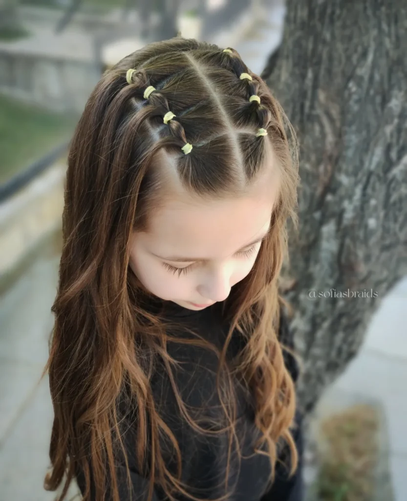 This one is especially wonderful for fine hair that can be tricky to braid. Small square sections along the hairline are secured with pale yellow elastics and linked together to create the most adorable daisy chain effect that frames the face beautifully before blending into long, flowing natural waves. It is gentle, it is pretty, and it is one of those styles that looks far more detailed than it actually is to create. A lovely everyday option for delicate hair.