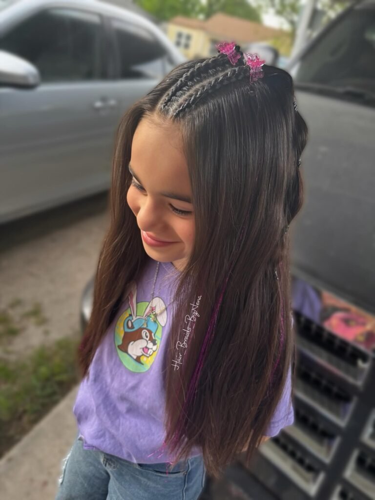 Hello, 90s nostalgia! Three neat cornrows braided straight back from the forehead are each topped with a translucent pink butterfly clip, while the rest of the hair flows long, dark, and sleek with a few hidden strands of pink tinsel for a fun little surprise. It is retro, it is cool, and kids absolutely love the butterfly clip moment right now. A quick, easy style that still looks really put together for a school day.