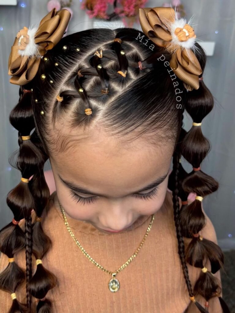 Saving the most extra one for last, and I mean that in the best possible way. An intricate criss-cross rubber band pattern on top accented with gold studs leads into two high bubble pigtails, each topped with a massive satin bow featuring the most adorable tiny teddy bear charm in the center. It is bold, it is detailed, and it is absolutely perfect for a special occasion or a day when your little girl just wants to feel like the most special kid in the room. Pure joy from root to tip.