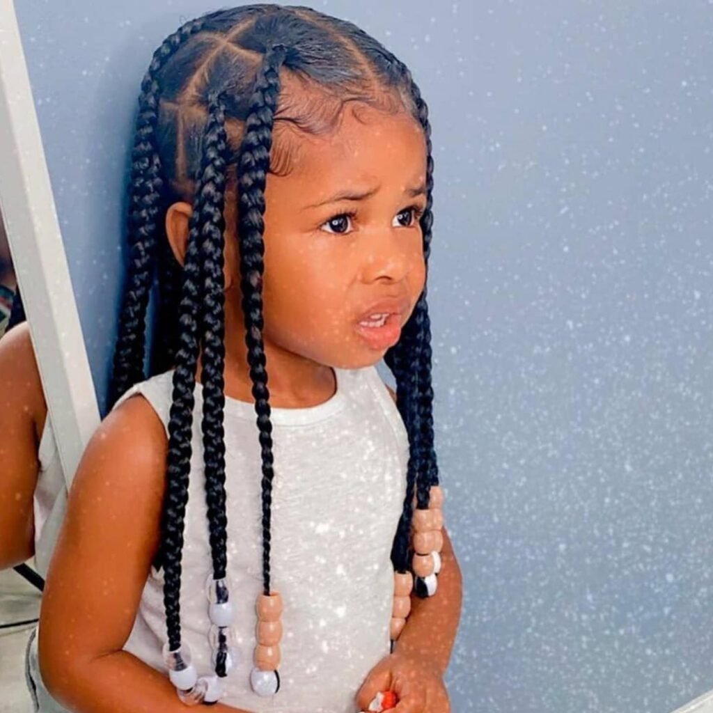 Box braids never go out of style, and this version is just the sweetest thing. Clean rectangular parting creates medium-sized braids that frame the face beautifully, and the ends are finished with a mix of opaque white and translucent peach beads that give a fun little clink with every step. It has this bright, beachy, summer-ready energy that kids absolutely love. A wonderful protective style that looks fresh and well-put-together every single school day.