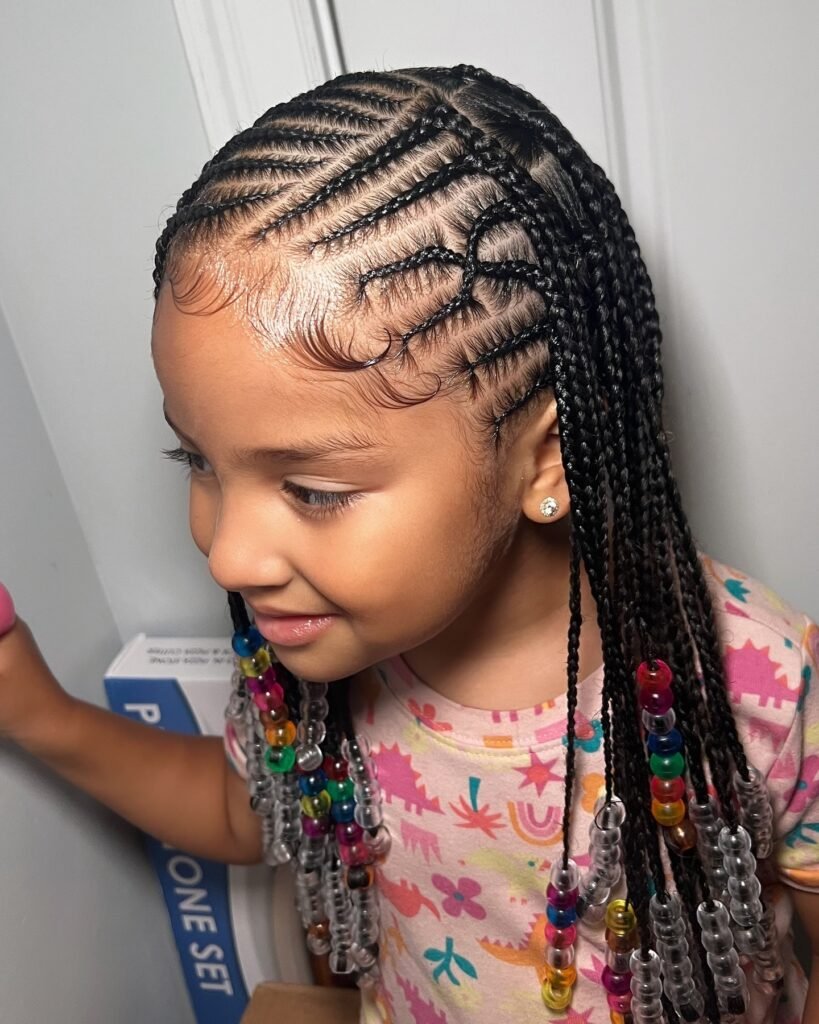 If your daughter loves color, she is going to lose her mind over this one. Curved cornrows create a gorgeous wave pattern across the scalp, and the braids hang down adorned with a full spectrum of transparent rainbow beads. It is vibrant, it is precise, and it is pure joy to look at. The geometric parting alone is a work of art, and the rainbow beads just take everything to another level. Perfect for a girl who loves to express herself boldly.
