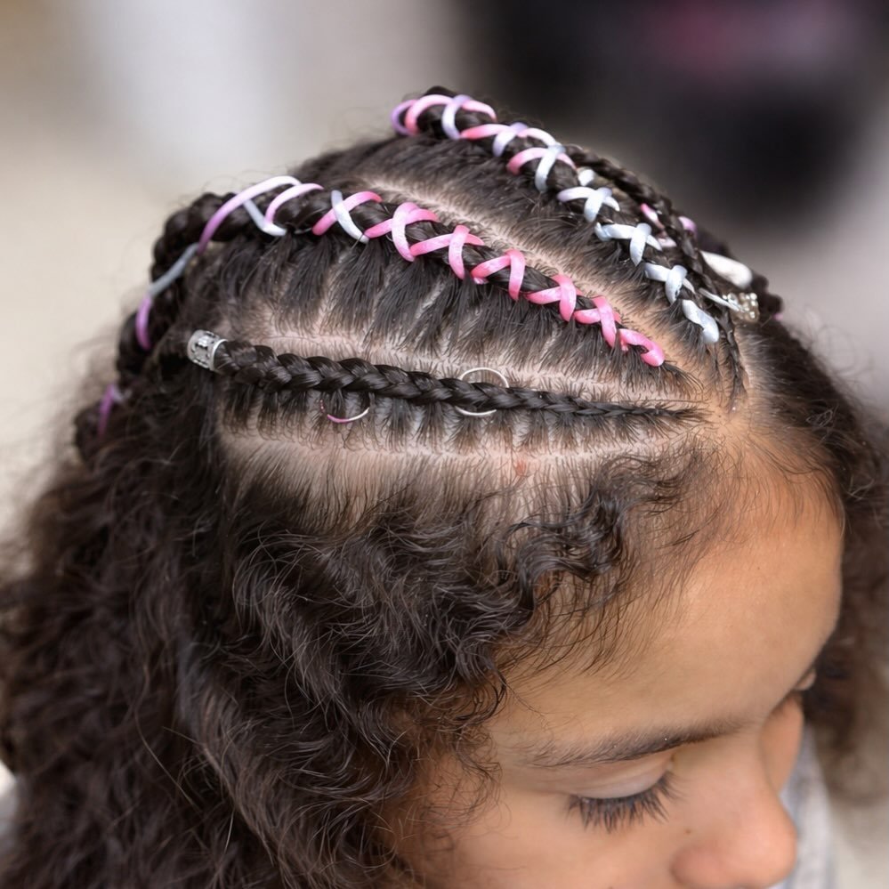 This style is a little more intricate but absolutely worth every minute. Rubber band threading creates a beautiful criss-cross pattern over traditional braids, woven through with pastel pink and white elastics and accented by silver hair rings. The back transitions into soft, natural curls for a lovely contrast in texture. It is delicate, it is detailed, and it feels really special. A great style for a school day when you want your little one to feel extra pretty.
