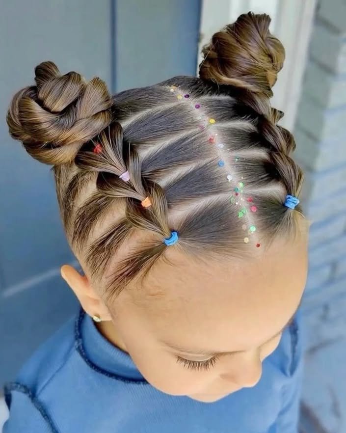 Okay, this one is just pure fun and I am completely here for it. A crisp center part dusted with colorful confetti glitter leads into two high space buns, and the front sections are detailed with diagonal parting and rainbow mini elastics that create the most adorable stitched effect. It is playful, it is bright, and it is the kind of hairstyle that makes kids feel like the coolest person in the classroom. Save this one for a really special school day.