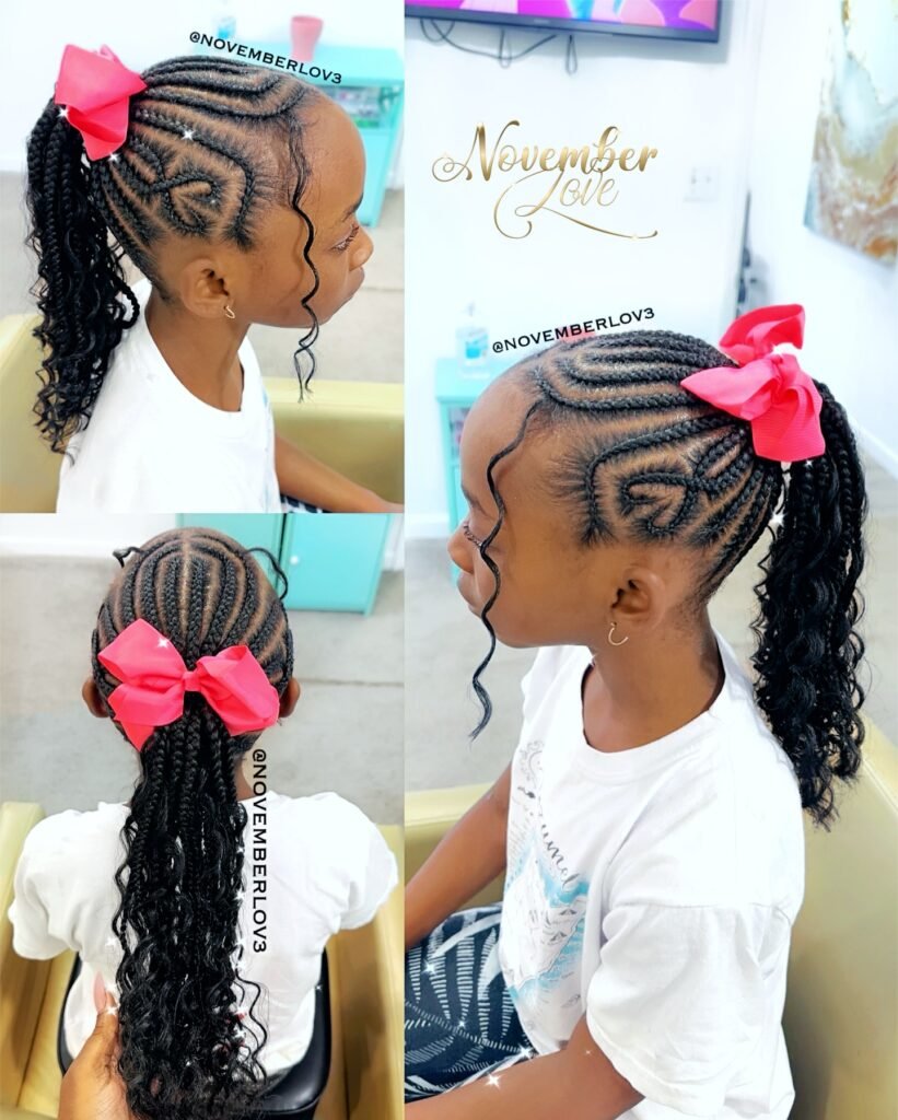 This style is genuinely impressive. Curved cornrows form a delicate heart shape on the side of the head, converging into a high ponytail of tight curls topped with a bold oversized pink bow. It is artistic, it is precise, and it balances creativity with real durability for a full day at school. The heart detail is subtle enough to feel elegant but fun enough that kids absolutely adore it. A beautiful protective style that doubles as a little work of art.
