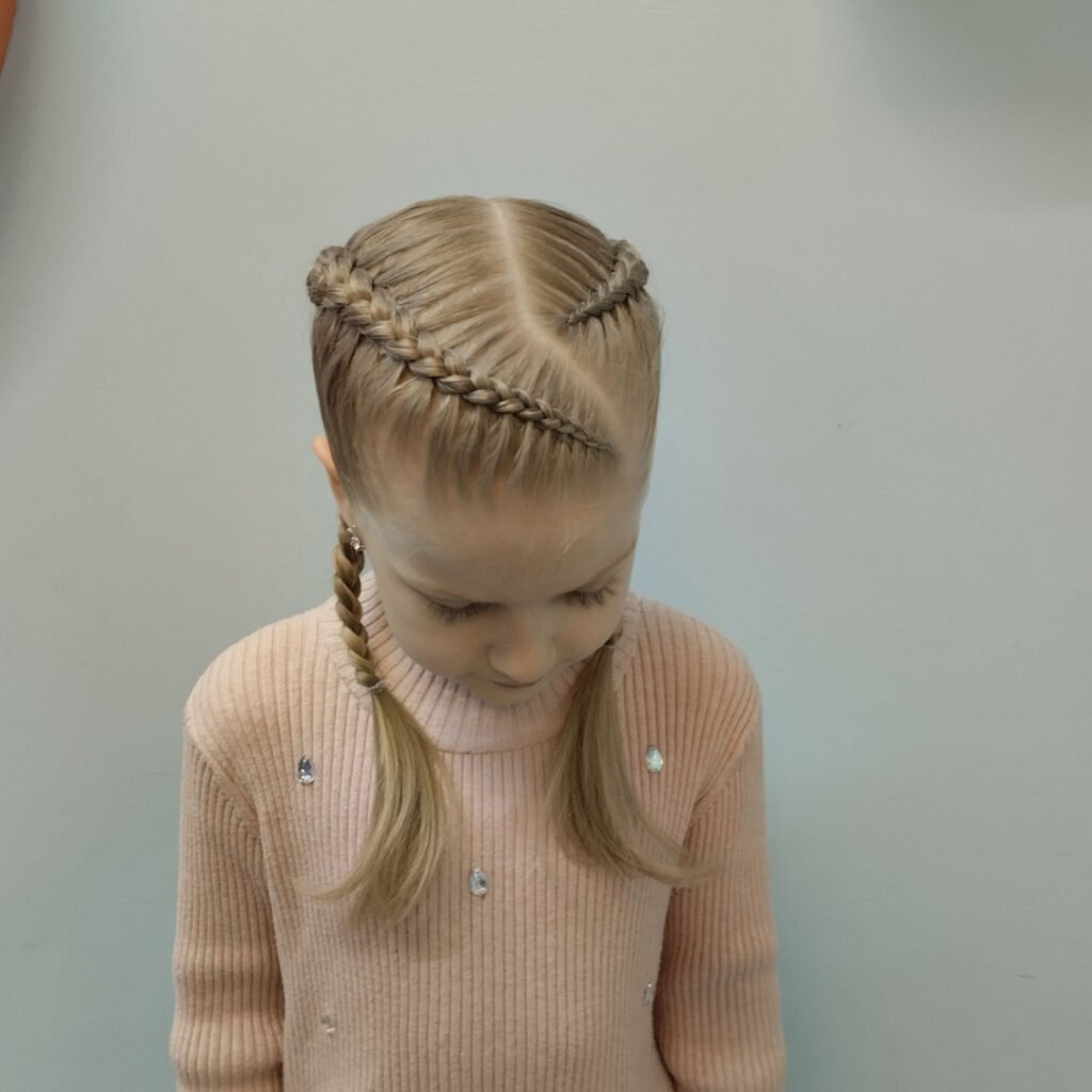 Sometimes the simplest styles are the most striking, and this one is a perfect example. A single thick French braid travels diagonally across the crown from the forehead to the ear, while the rest of the hair stays smooth and neat, ending in simple pigtails. It is clean, it is polished, and it works just as beautifully for a regular school day as it does for a formal event. If you are short on time but want something that looks intentional and pretty, this is your go-to.