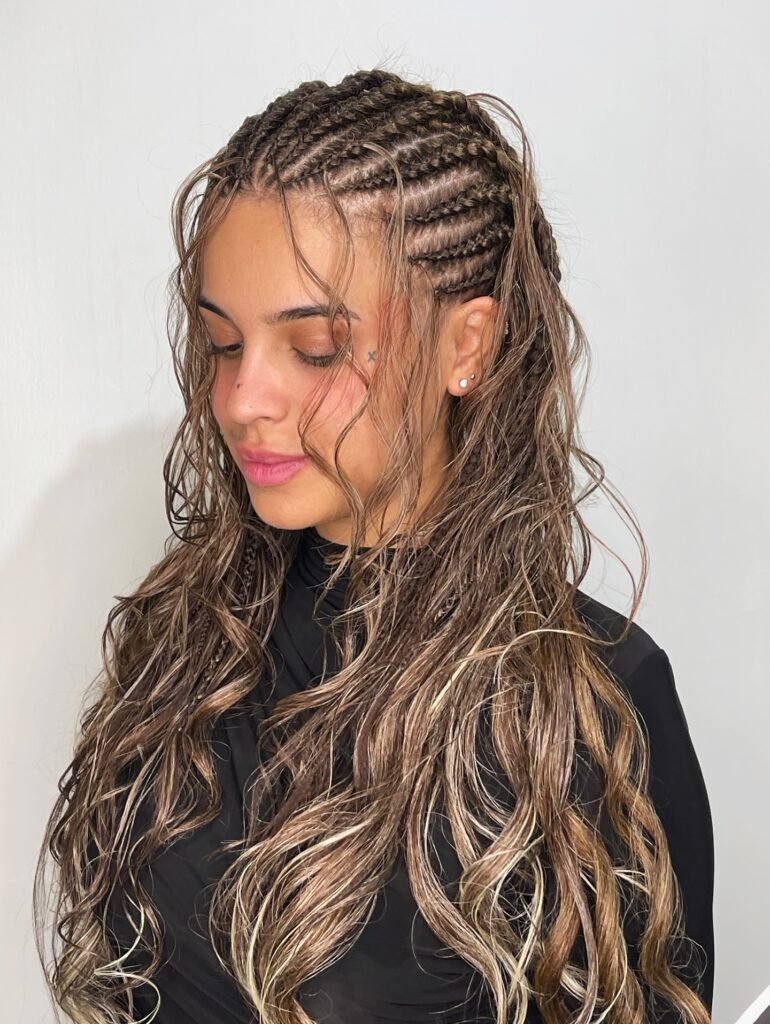 This style is such a beautiful display of fluid motion and expert skill. Sweeping S-curves radiate from a side part and flow across the scalp in the most rhythmic, organic way, highlighting exactly how talented and precise the braider is. It is soft, it is feminine, and it offers such a fresh and elegant alternative to traditional straight-back rows. The curved pattern frames the face so beautifully that it almost feels like the style was designed specifically for you.
