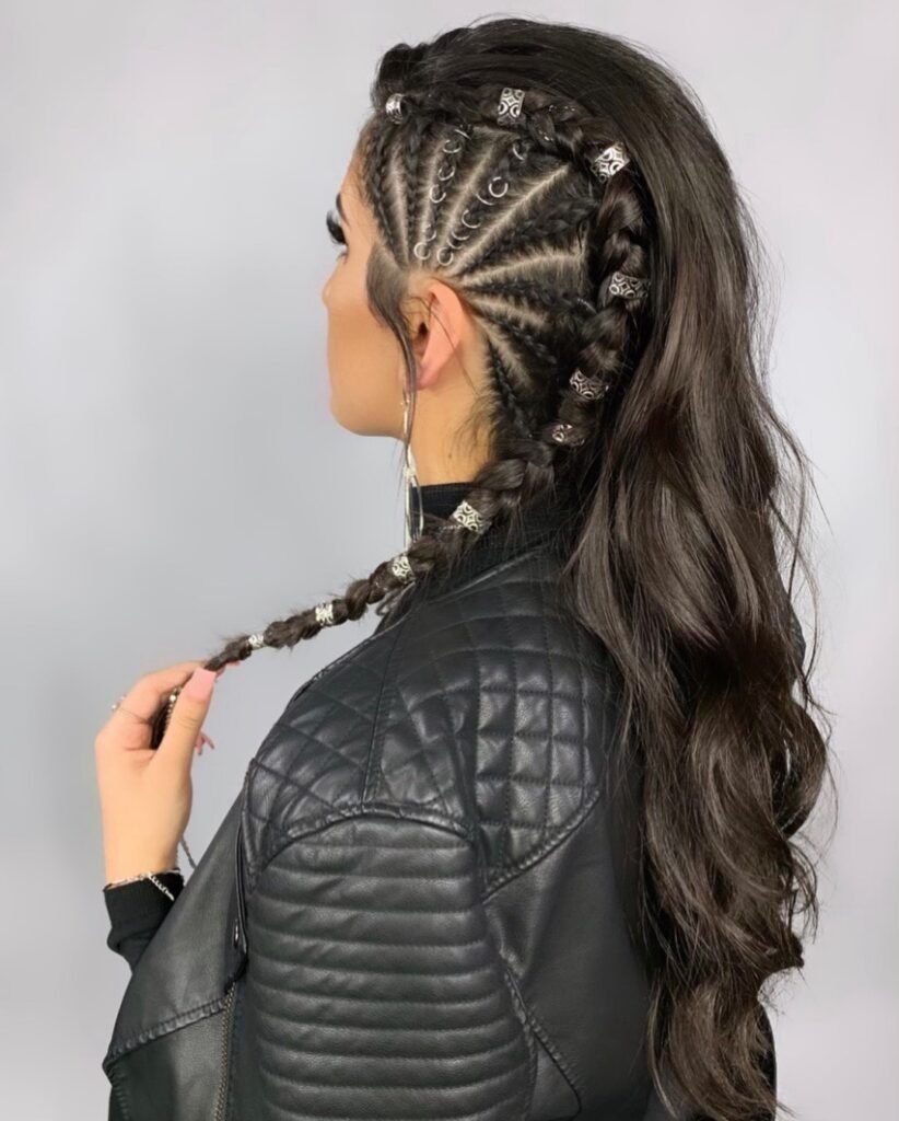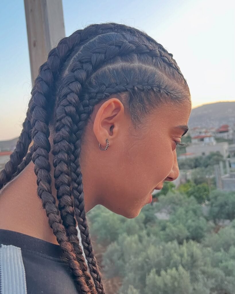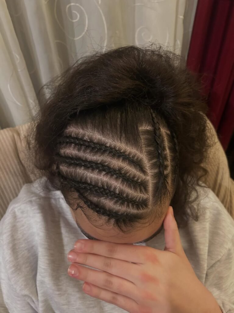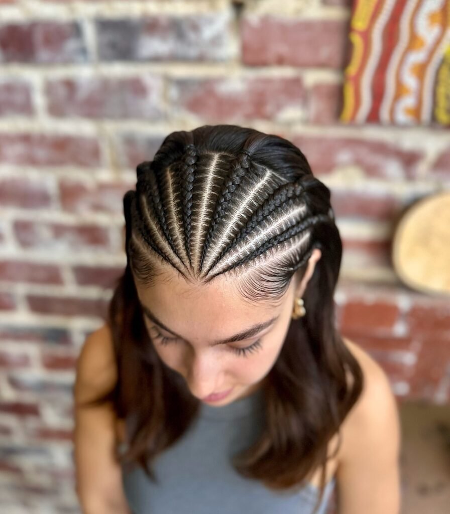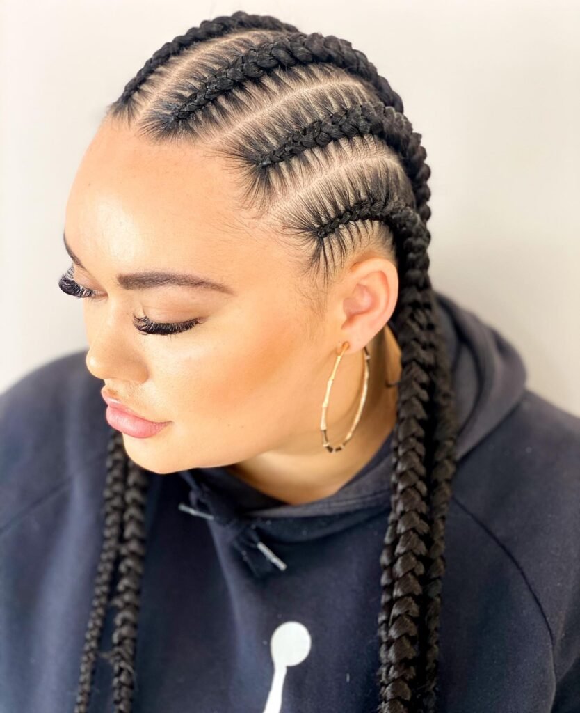 This one is pure boldness and I absolutely love it. The scalp is divided into sharp, lightning-bolt parts, and each braid follows that jagged path to create a high-texture, visually captivating pattern that looks like it belongs in an art gallery. It is modern, it is edgy, and it pushes the boundaries of what traditional braiding can look like in the most exciting way. For the girl who loves to stand out and is not afraid to be a little daring with her hair, this is your style.