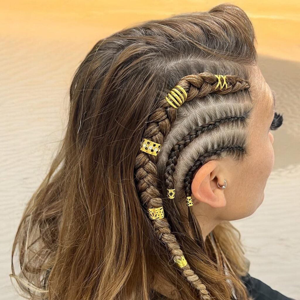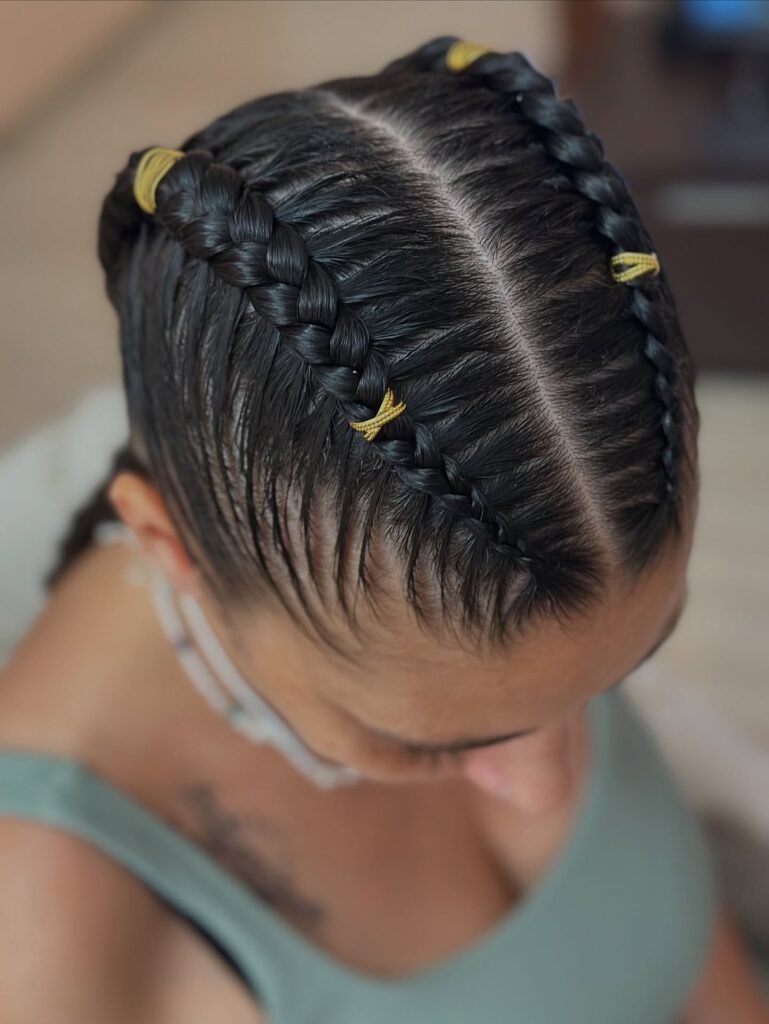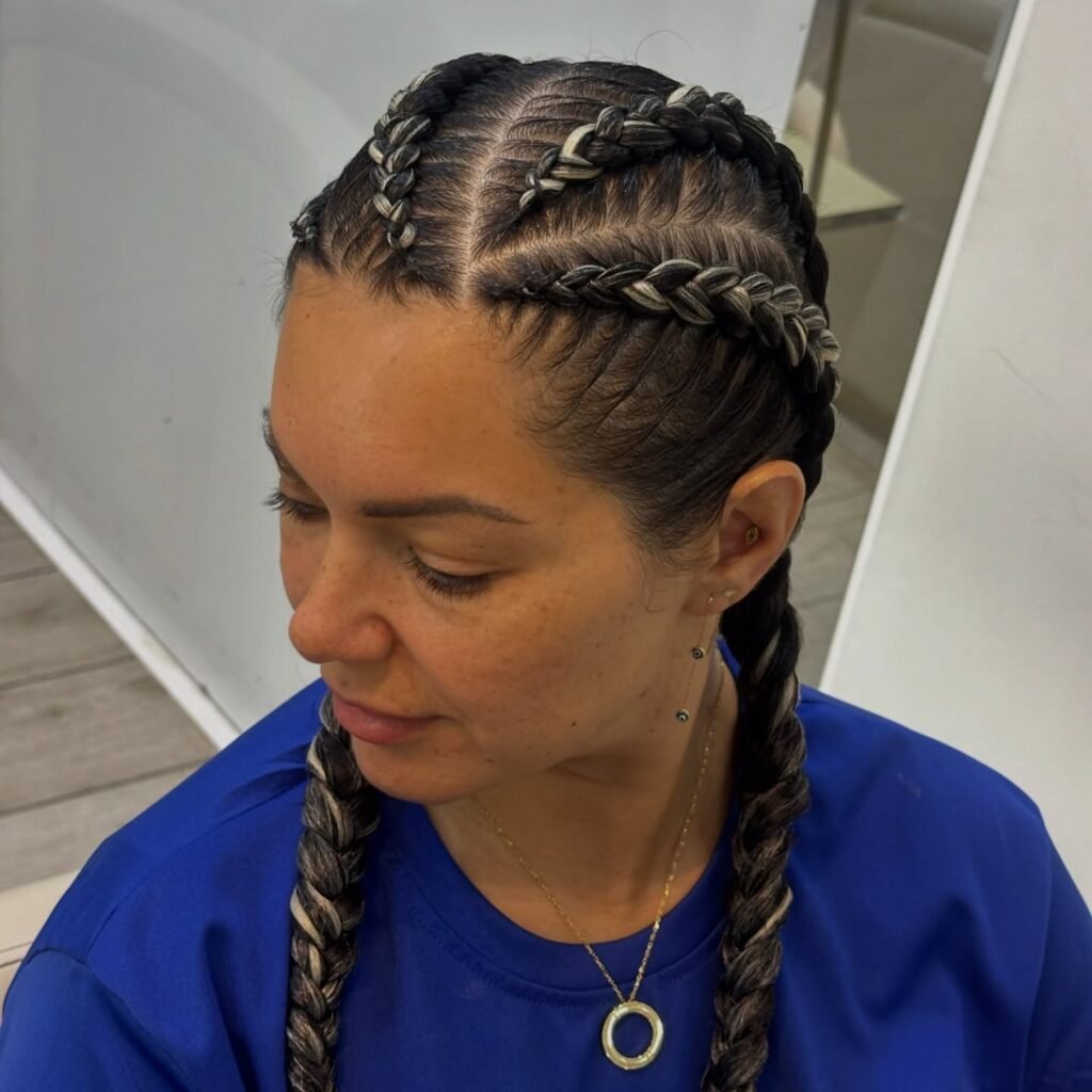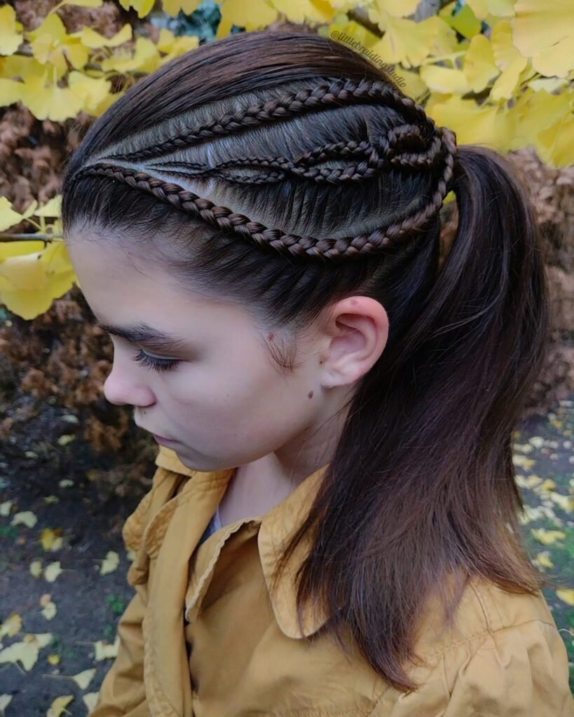 This one is pure boldness and I absolutely love it. The scalp is divided into sharp, lightning-bolt parts, and each braid follows that jagged path to create a high-texture, visually captivating pattern that looks like it belongs in an art gallery. It is modern, it is edgy, and it pushes the boundaries of what traditional braiding can look like in the most exciting way. For the girl who loves to stand out and is not afraid to be a little daring with her hair, this is your style.