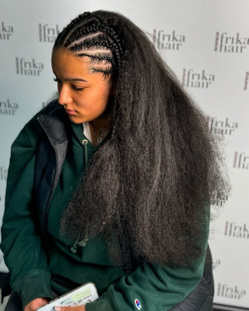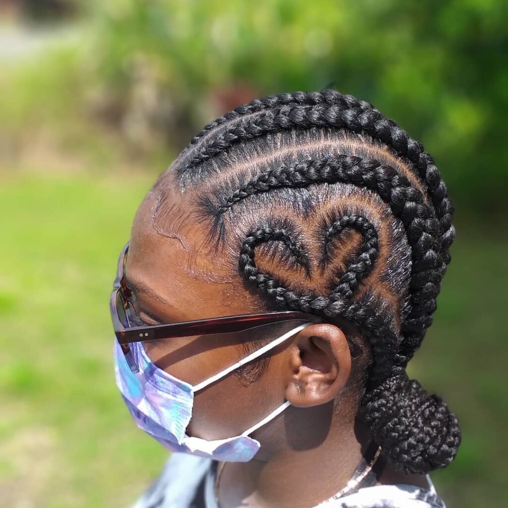 This one just makes me smile every single time I see it. Thin cornrows curve delicately to form subtle heart shapes woven seamlessly right into the flow of the hair, and the level of craftsmanship and attention to detail required to achieve this is truly impressive. It is playful, it is romantic, and it is the kind of style that tells the world a little something about your personality the moment people see it. A beautifully personal and utterly charming choice for anyone who loves a little extra meaning in their hair.