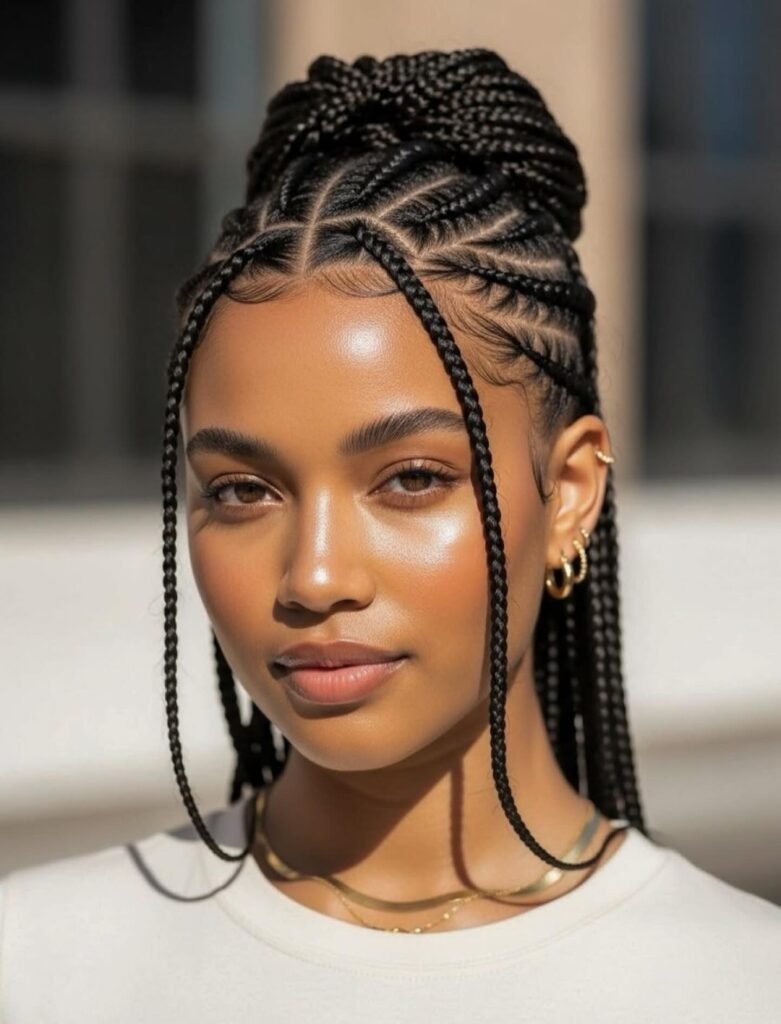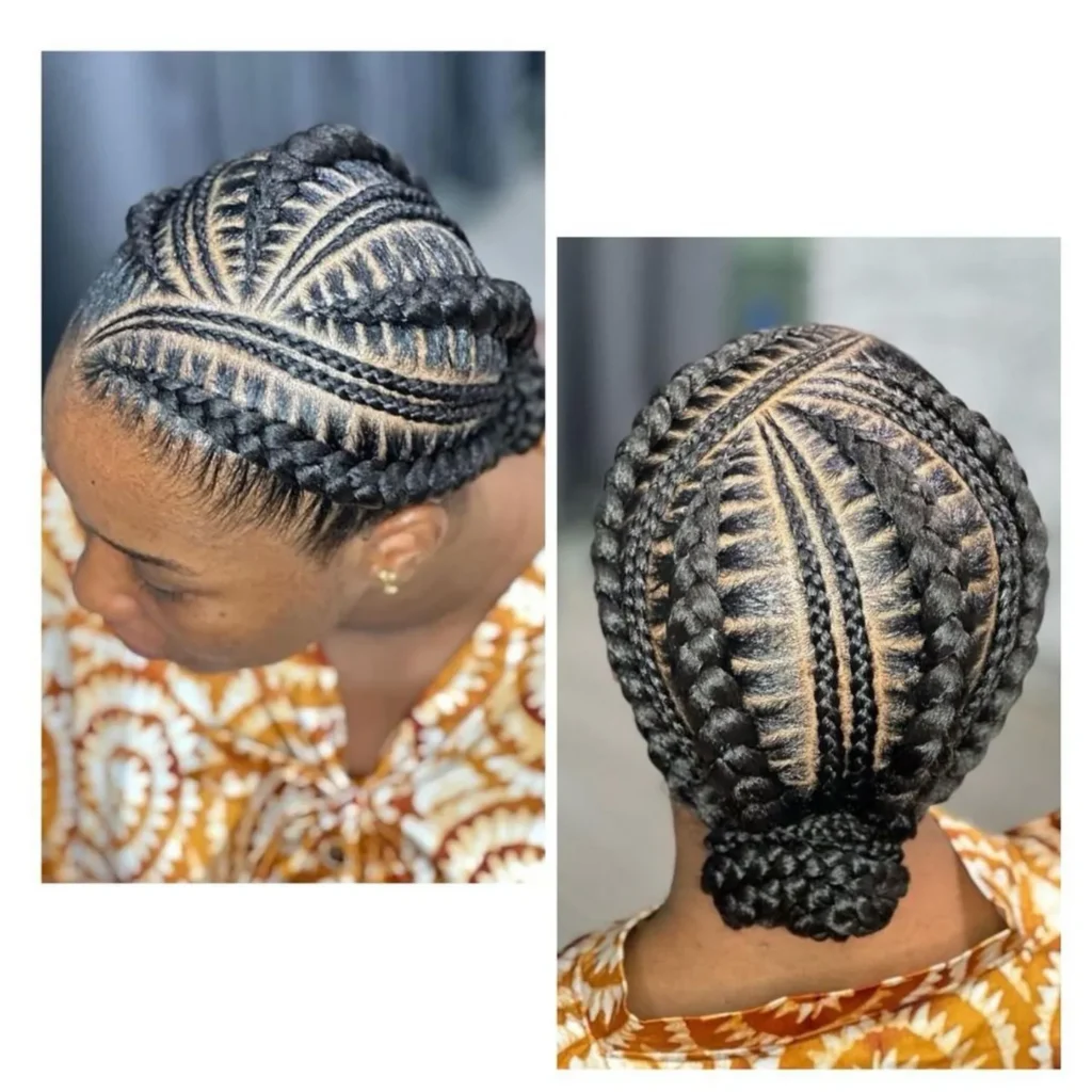 This one combines the best of protective styling with real high-glamour energy. Intricate cornrows are braided upward from the nape and sides toward the crown, where everything meets and is gathered into a voluminous, textured bun that looks absolutely stunning. The complex scalp pattern acts as its own built-in accessory, so you genuinely do not need anything else to complete the look. It is secure, it is sophisticated, and it is an ideal choice for formal events where you want to look polished and put together all night long.