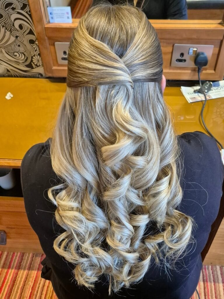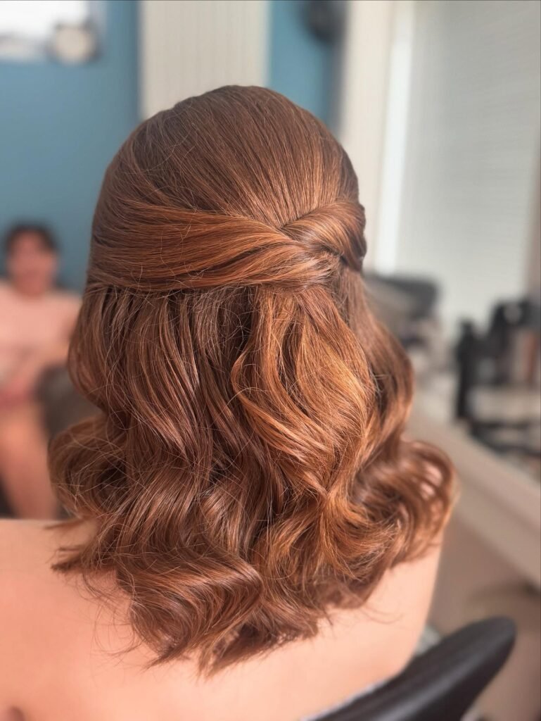 For the girl who loves clean lines and quiet luxury, this one is perfect. The front sections are sleeked back and crossed over at the crown to form a seamless wrap that adds just the right amount of height, while voluminous honey-blonde curls flow freely below. It is polished, it is modern, and it has this understated elegance that pairs beautifully with high-neck or heavily detailed gowns. Sometimes the cleanest styles make the biggest impression.