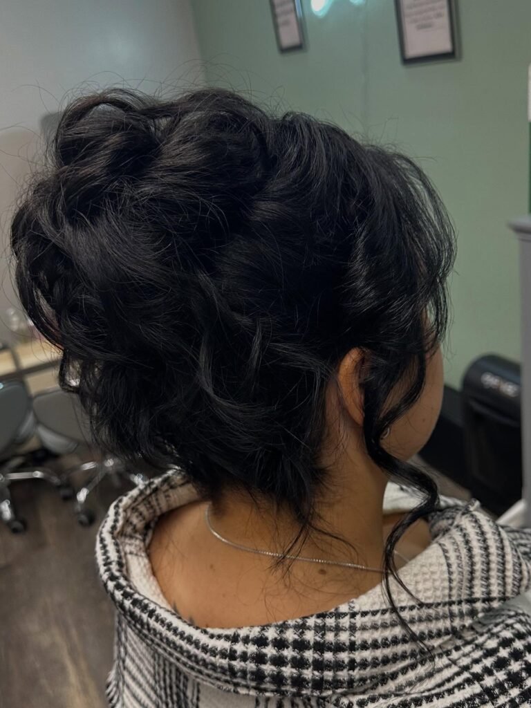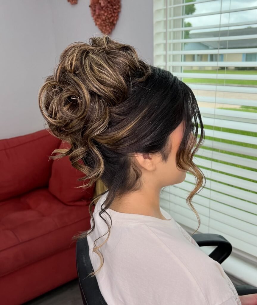 Dark, dramatic, and seriously stunning. Instead of a smooth, sleek bun, the raven-colored hair is styled into high-volume, shredded loops that create a bold, edgy silhouette unlike anything else on this list. Spiraled tendrils fall softly from the nape and sides to keep everything feminine and soft despite the high-impact height. If you love bold fashion choices and want a prom hairstyle that really reflects your personality, this one is made for you.