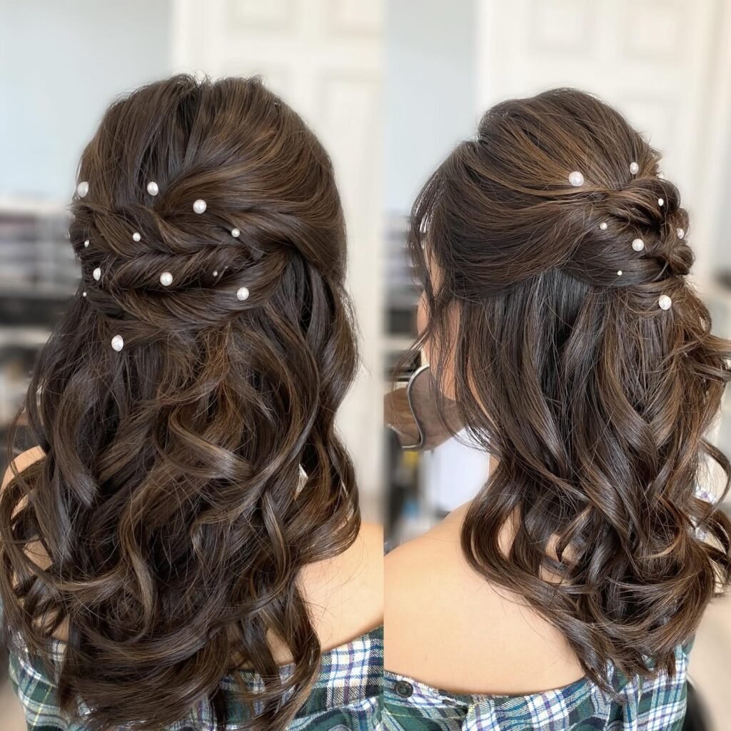 This one is like wearing a starry sky in your hair, and it is just as magical as that sounds. A textured half-up design is loosely woven across the back, and varying sized pearls are scattered throughout the waves to create a luminous constellation effect. Below it, rich espresso curls bounce with incredible shine and life. It is breathtaking, it is unique, and it is the kind of hairstyle that people will be talking about long after prom night is over.