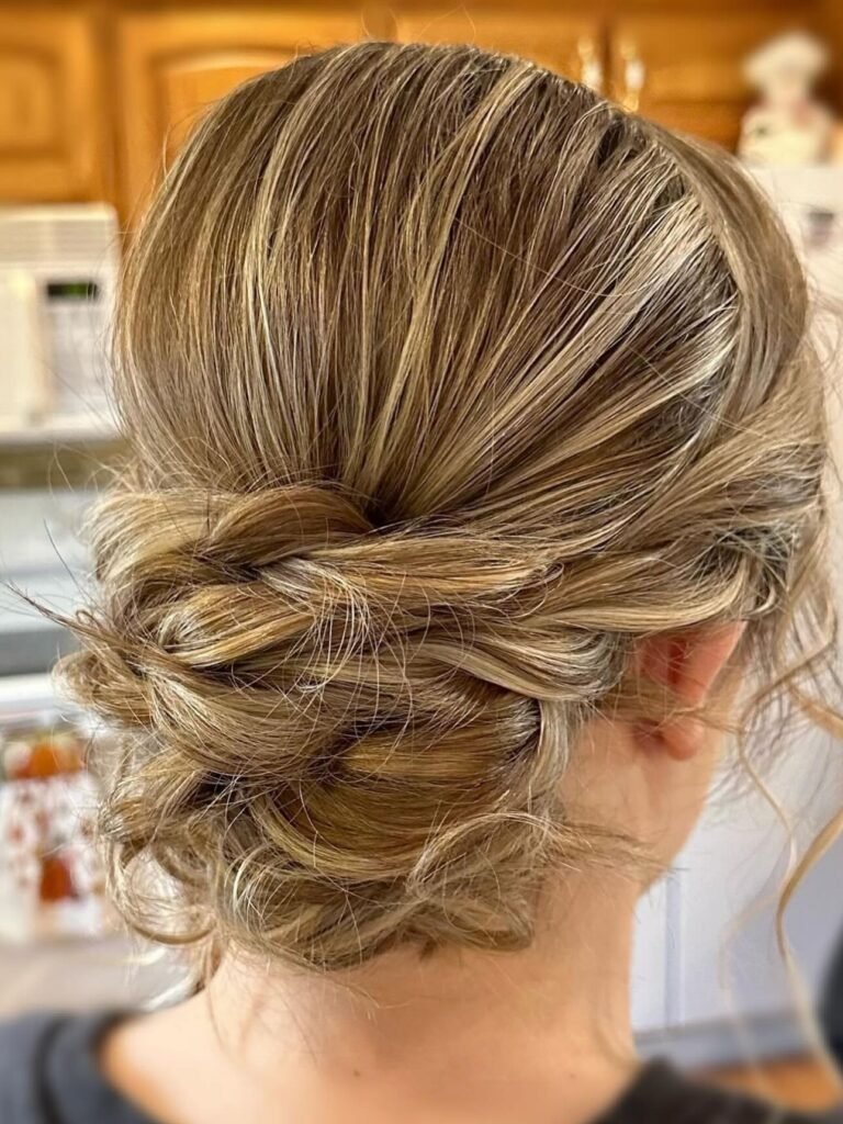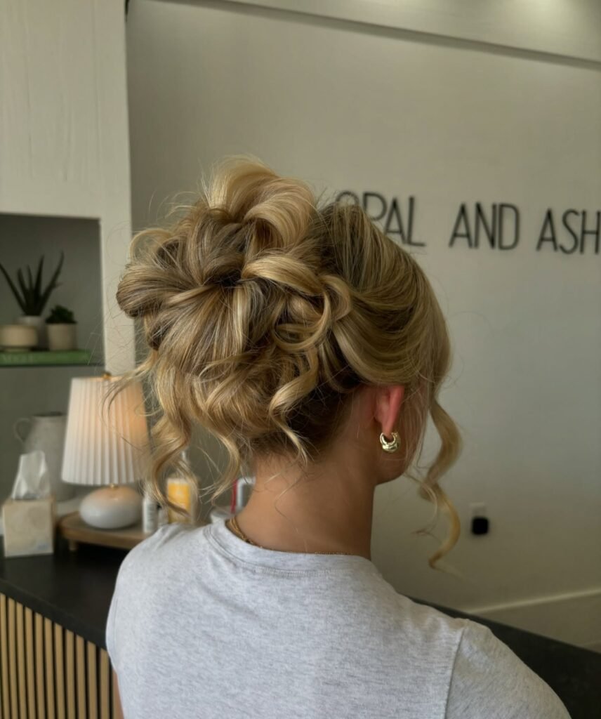 Blondes with natural highlights are going to love this one so much. The hair is gathered into a series of soft, petal-like loops that form a voluminous, airy messy bun at the back, and delicate face-framing ringlets are left loose at the ears and temples for the softest, most romantic finish. It is formal enough for prom but has this effortless quality that keeps it from feeling too stiff or overdone. Light, pretty, and absolutely lovely.