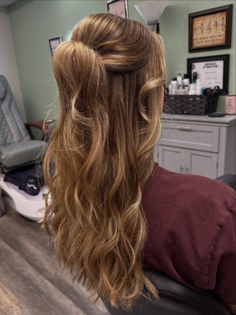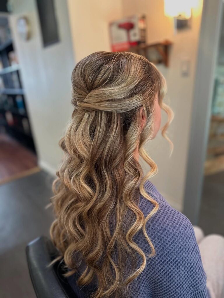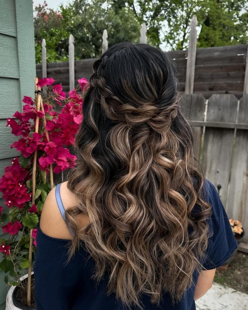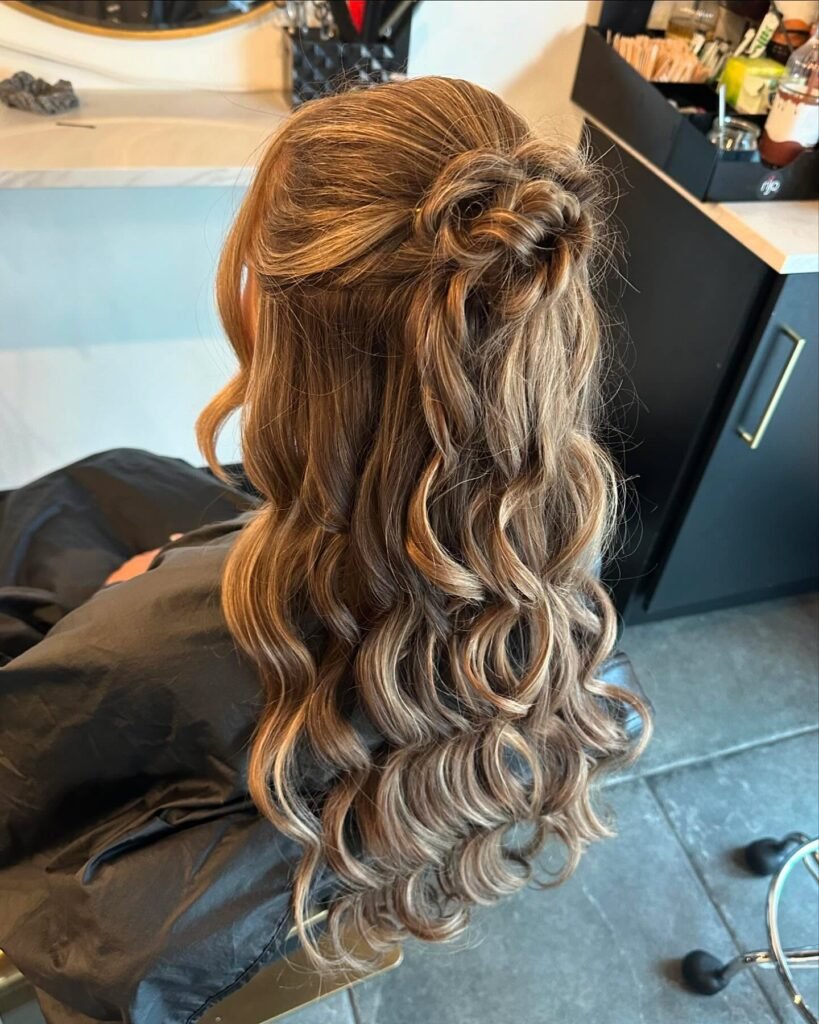 This is such a creative and beautiful concept, using nothing but the hair itself to create a floral moment. The top sections are knotted into a rose-like shape at the center, and the caramel-toned hair flows below in long, ribbon-like curls that show off every gorgeous depth of the balayage. It is artsy, it is feminine, and it is a really fresh, unexpected way to wear a half-up style for prom. One of those looks that gets better the longer you look at it.