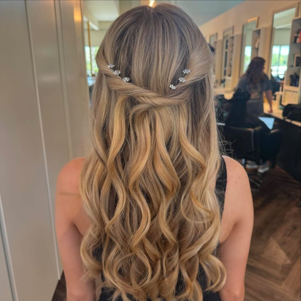 This one brings serious bridal-level elegance to prom night. A sophisticated double-twist at the crown is pinned with delicate diamond-encrusted floral clips that add the most beautiful sparkle, and below it, extremely defined cascading ringlets create a stunning high-contrast texture against the smooth top. The ash-blonde tones make the whole thing feel very cool, very polished, and very elevated. A style that belongs on a red carpet as much as a prom dance floor.
