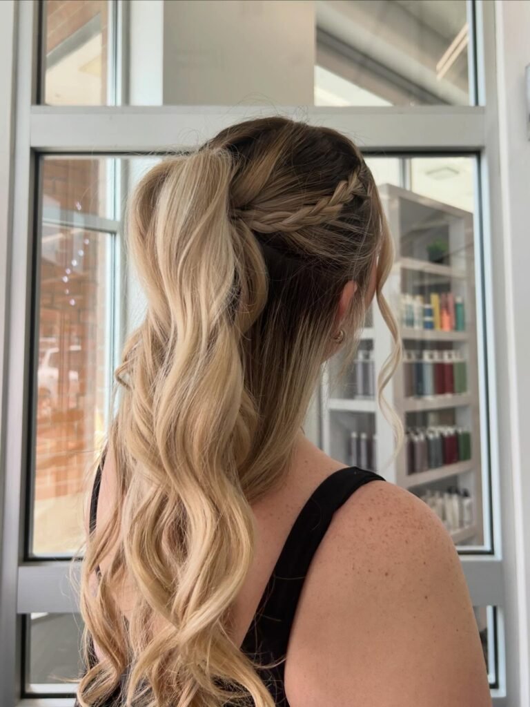 Sporty meets glamorous in the best possible way with this one. A thick, romantic braid runs along the side and feeds right into the base of a high ponytail, giving the whole look a really unique and elevated feel. A small section of hair is wrapped around the elastic for that flawless, seamless finish, and the long bouncy waves flow with so much movement underneath. It is fun, it is chic, and it is the kind of prom hairstyle that photographs beautifully from every angle.