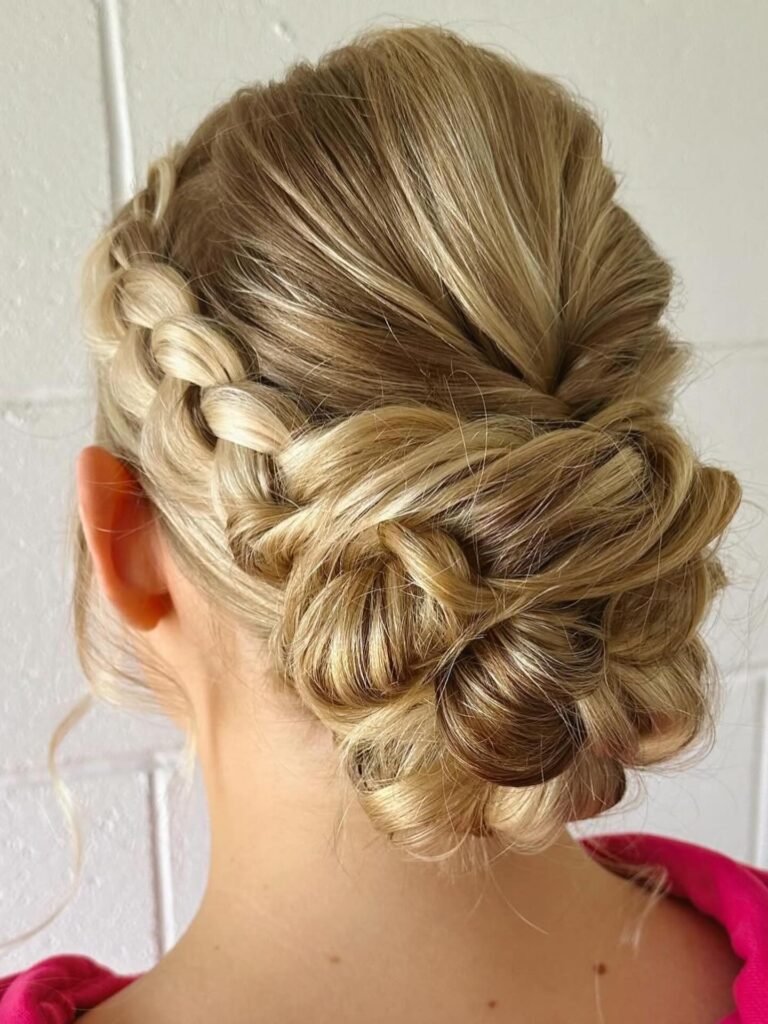 Finishing with this absolutely stunning updo that is a true showcase of beautiful multi-tonal blonde hair. A side French braid combines with overlapping twists that wrap into a large, multi-layered bun, and the intricate layering creates a 3D effect that looks detailed and interesting from absolutely every angle. It is complex, it is beautiful, and it is the kind of hairstyle that makes people ask who did your hair the moment they see it. A perfect way to end your prom night on the highest possible note.