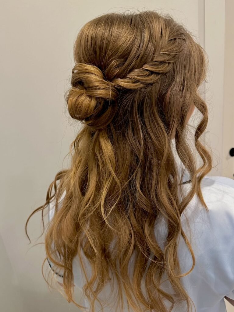 This one feels completely handcrafted and one-of-a-kind, which is exactly what you want for prom. A chunky side braid transitions into a rosette bun pinned at the back, while the rest of the hair falls in relaxed, beachy waves. It combines so many beautiful textures and techniques in one look that the result feels really artsy and special. If you want a prom hairstyle that nobody else is going to show up wearing, this is absolutely it.