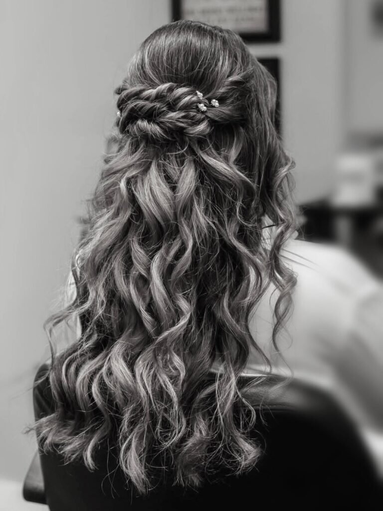 This one gives major fairytale energy and I am completely obsessed with it. A thick crown-like braid wraps around the back of the head like a halo, with delicate pearl pins tucked into the woven strands for a touch of classic sparkle. The remaining hair falls in long, defined waves beneath it, creating the most timeless and feminine silhouette. If you have ever wanted to feel like a princess on prom night, this hairstyle is going to make that happen.