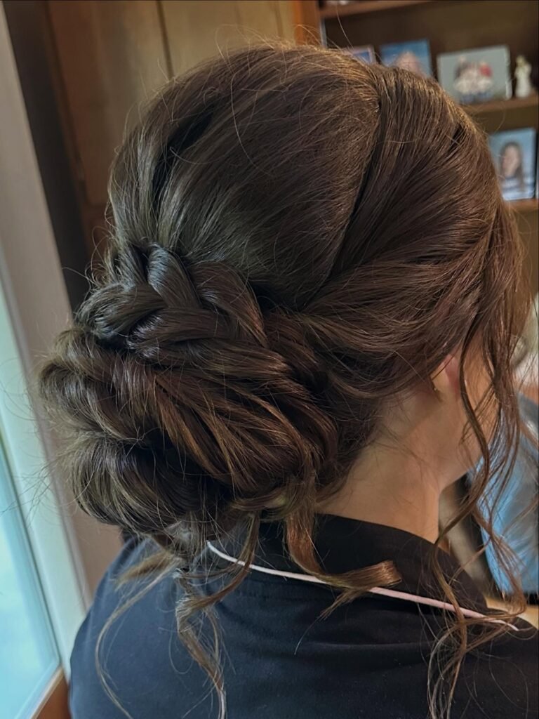 Dark hair looks absolutely stunning in this style. Deep brunette hair is woven into a large, textured chignon at the nape of the neck with subtle braids woven in for extra depth and detail. Long, delicate curls left loose around the face and ears soften the whole structured look and add a touch of effortless romance. It is sophisticated, it is minimalist, and it is the kind of style that lets your face and your dress take center stage beautifully.