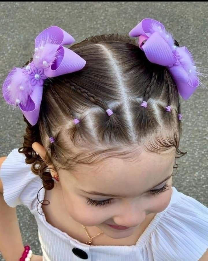 Now this one is for when you really want to go all out. The parting across the crown is perfectly geometric, dozens of tiny purple elastics add incredible texture, and the pigtails are finished with the most gorgeous oversized lavender bows with pearl and feather accents. It’s a high-fashion, pageant-worthy look, but honestly it’s also just a really stunning school style for a special day. If your daughter loves feeling like a princess, this is it.