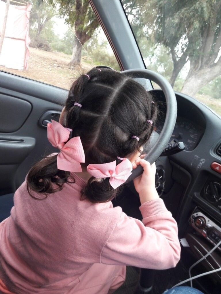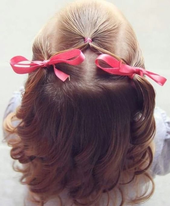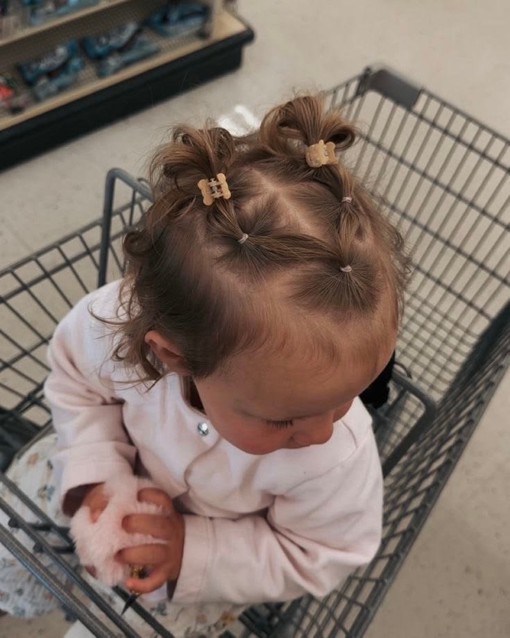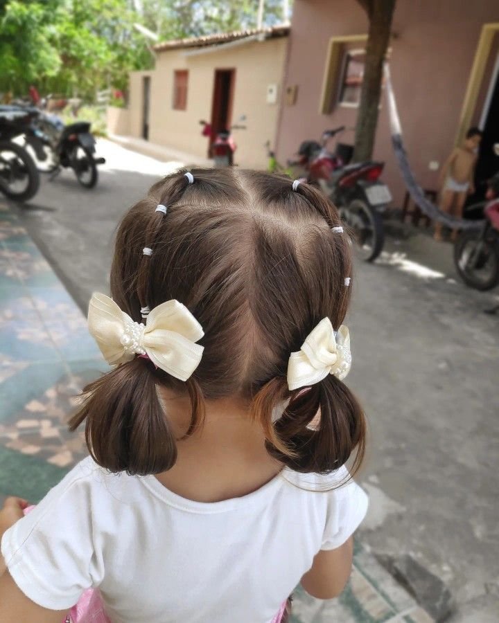 Got a little one with fine hair that never seems to stay put? This is your go-to. You just gather thin sections around the face with small white elastics and pull everything back into two adorable messy-cute pigtails. The white grosgrain bows at the end give it that sweet, timeless finish. It’s simple, it’s quick, and it works beautifully for both daycare and school. Sometimes the simplest styles are just the prettiest.