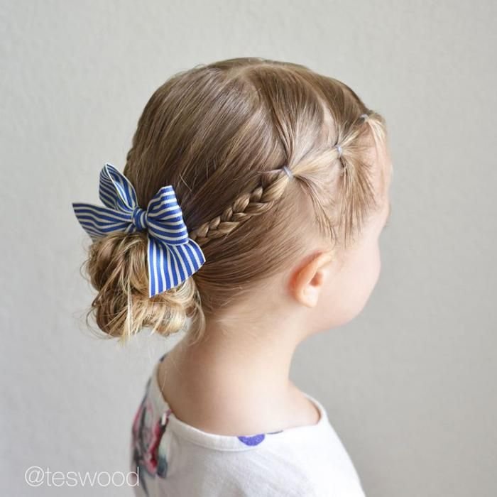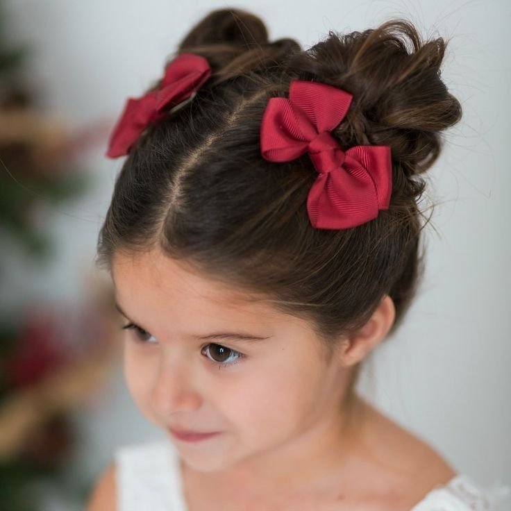 Okay, this one is technically a school style but it’s also fancy enough for holiday photos and family events, so it does double duty! You create two large space buns high up on the crown, add some beautiful oversized burgundy red grosgrain bows, and that’s it. It’s one of those styles that looks really special without being complicated. Your little girl is going to feel like a total star wearing this.