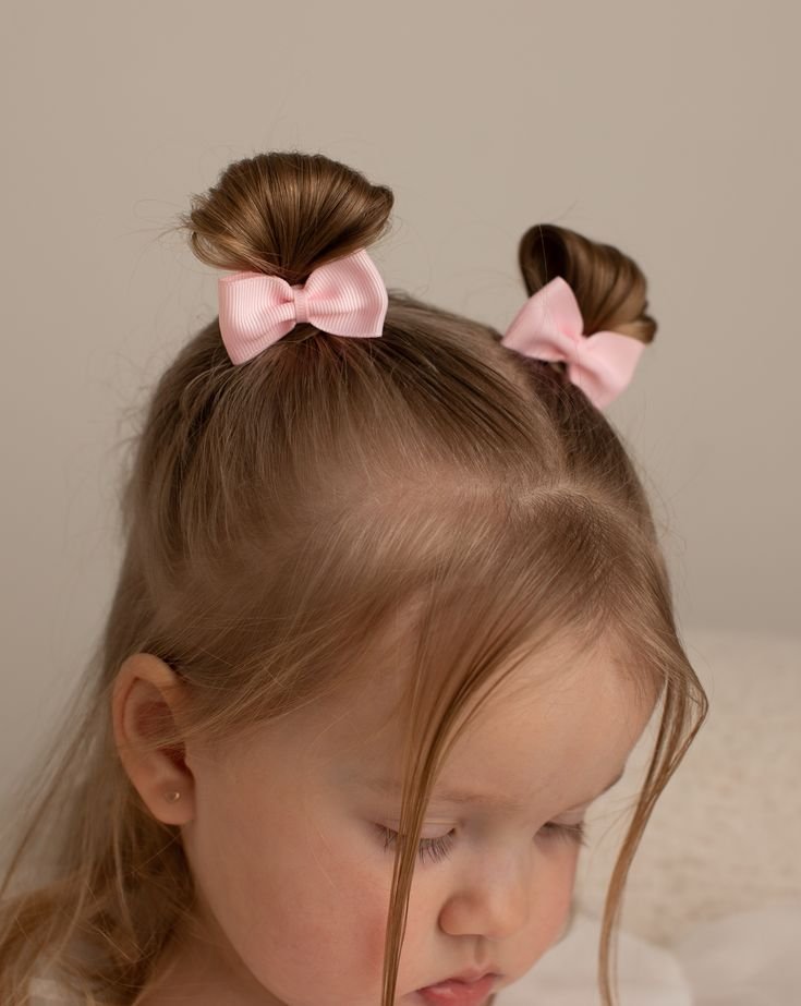 This is such a soft, pretty look. I always say it’s the style that feels like a hug. You pull small, clean sections from the hairline into mini pigtail buns, positioned nice and high. Then you add pale pink ribbon bows for that gentle, elegant touch. It’s tidy, it holds well through a full school day, and it has this quiet sophistication that works perfectly for younger girls. Just the sweetest thing.