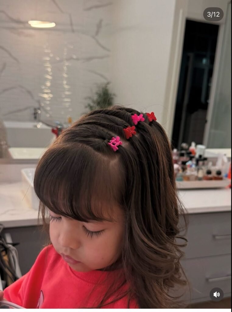 If your daughter has bangs or a heavy fringe, you know the daily struggle of keeping them out of her eyes. This style solves that in literally under a minute. You just clip two mini butterfly claw clips right behind the fringe to section it back, and let the rest of the hair flow naturally. It’s got that sweet 90s nostalgia feel, and honestly it’s so cute for school. Plus, little girls love picking out their butterfly clip colors, it becomes a fun morning ritual!