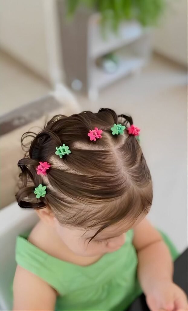 Think of this as the upgraded version of the butterfly clip look. Instead of just clipping the fringe, you twist and pin sections all around the crown using alternating pink and green mini butterfly clips. It creates a full halo effect that highlights the hair’s natural wave, it’s so pretty! And the best part? It takes just a few minutes and is totally heatless. If your toddler hates sitting still for styling, we’ve all been there, this is an absolute lifesaver.