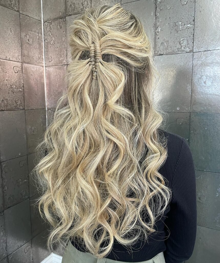 This one makes such a beautiful statement for a tea party setting. Dark blonde hair is transformed into a series of delicate interlocking loops that mimic a crown, creating incredible volume and shine from every angle. The defined ringlets catch the light in the most gorgeous way, and soft tendrils framing the neck add just the right amount of feminine elegance to keep it from feeling too structured. It is polished, it is detailed, and it is exactly the kind of hairstyle that feels perfectly at home at a beautiful tea party table.