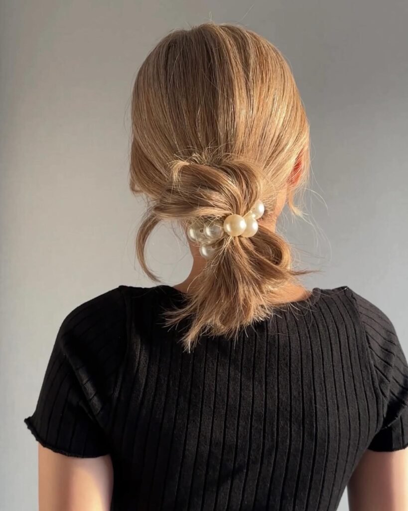 Sometimes the simplest ideas are the prettiest, and this one is a perfect example of that. A soft, wide satin ribbon tied into a bow transforms a simple low ponytail into a detailed, feminine statement that feels completely intentional and charming. The warm blonde hair is smoothed for maximum shine, and face-framing pieces keep the whole look soft and modern rather than overly formal. It is sweet, it is easy, and it is absolutely adorable for a garden café or a casual afternoon tea with friends.