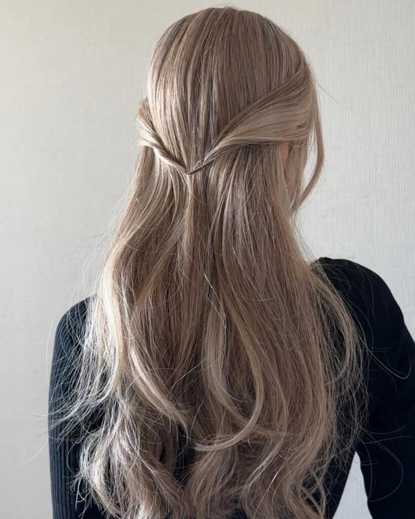 This one is for the girl who loves that perfectly undone, effortlessly chic aesthetic. Light to mid brunette hair with golden lowlights is loosely pulled back with soft volume at the crown and secured into a casual, textured bun with a trendy patterned claw clip, while the rest of the long waves cascade naturally below. It is relaxed, it is modern, and it has this easy confidence that makes it feel really fresh and stylish without looking like you tried too hard. A great choice for a more casual afternoon tea.