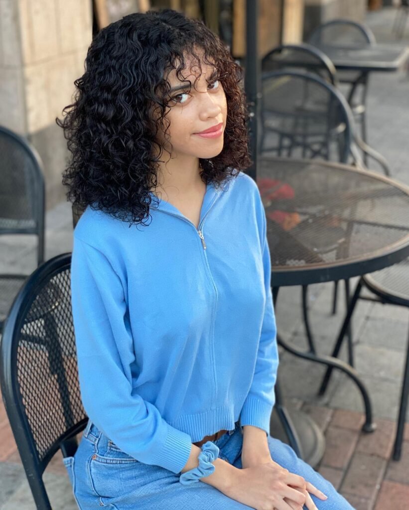This one has such a breathtaking, high-glamour quality while still feeling completely appropriate for a beautiful afternoon tea. A braid along the crown transitions into a loose twisted horizontal wrap, and varying sized white pearls are scattered throughout the weaves like a constellation of tiny stars. Deep chocolate curls with incredible definition and shine flow below. It is elegant, it is detailed, and it is the kind of hairstyle that gets compliments from across the room before you even sit down.