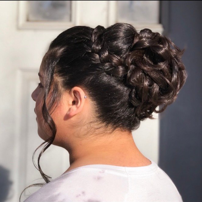 This one feels like it was made specifically for a garden tea party. A Dutch braid wraps gracefully along the side of the head like a natural halo, feeding into a low, multi-textured bun made of soft loops. Long face-framing ringlets fall gently around the ears, adding a soft, romantic frame to the whole look. It is intricate, it is nature-inspired, and it stays perfectly in place through every cup of tea and every lovely conversation. A truly beautiful style for an outdoor afternoon.