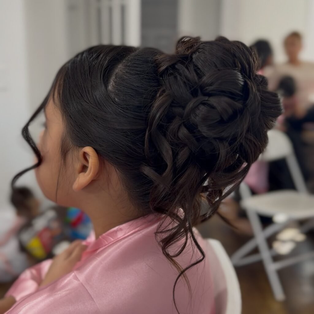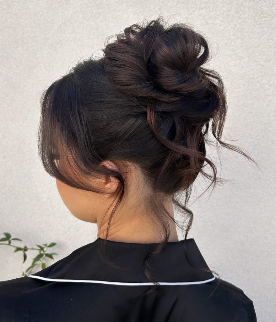 This one is bold, modern, and completely striking. Dark, glossy hair is gathered into a large architectural swirl at the crown that commands attention the moment you walk into a room. The sides are smoothed to emphasize the volume of the bun, and a thick side-swept bang combined with long curly tendrils adds a soft, high-fashion finish that keeps everything feeling beautiful rather than overdone. For the girl who loves to make an entrance, this is the updo.