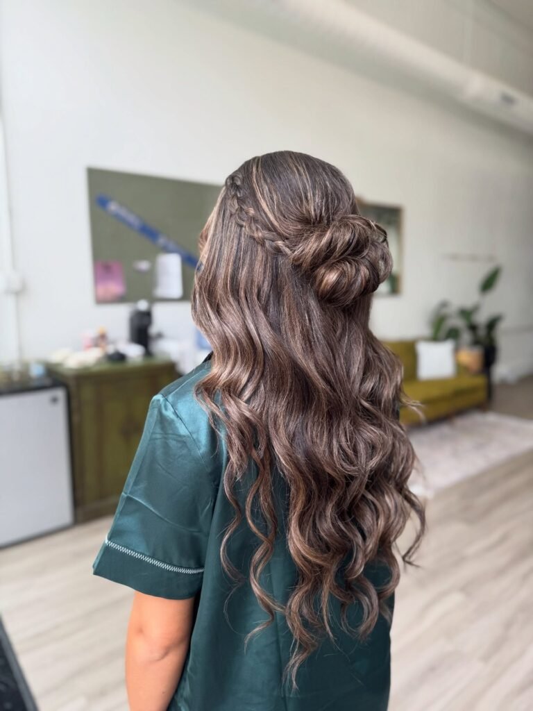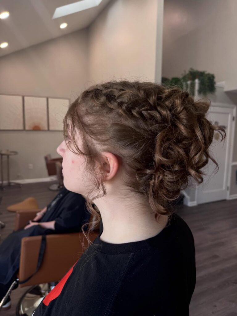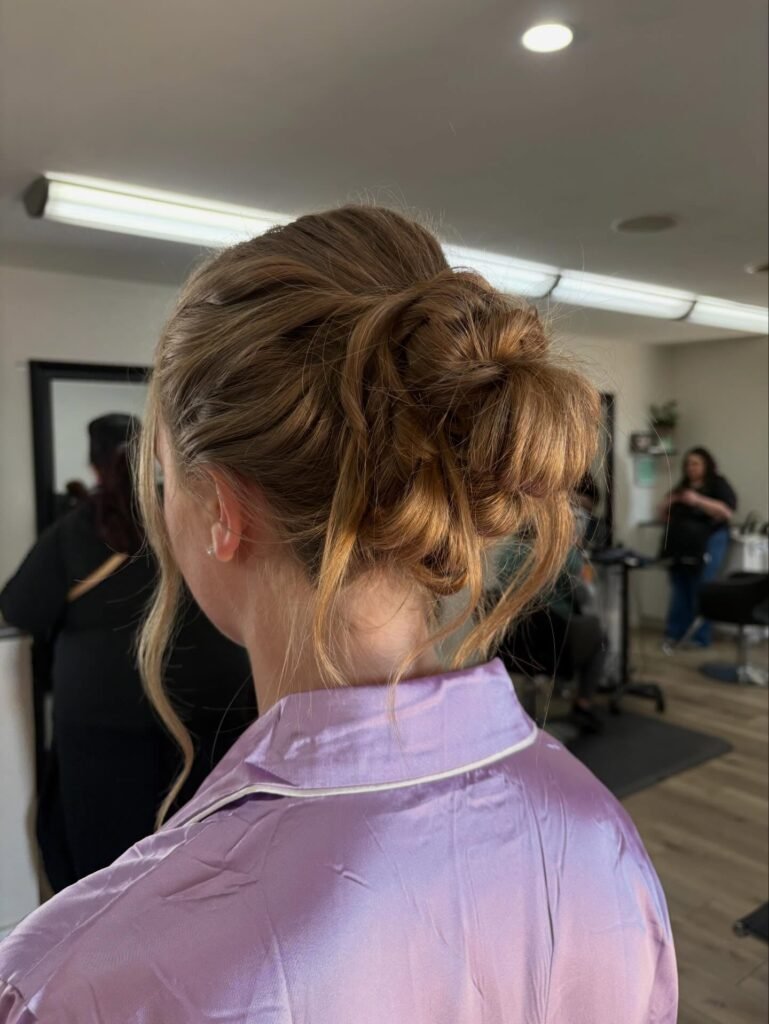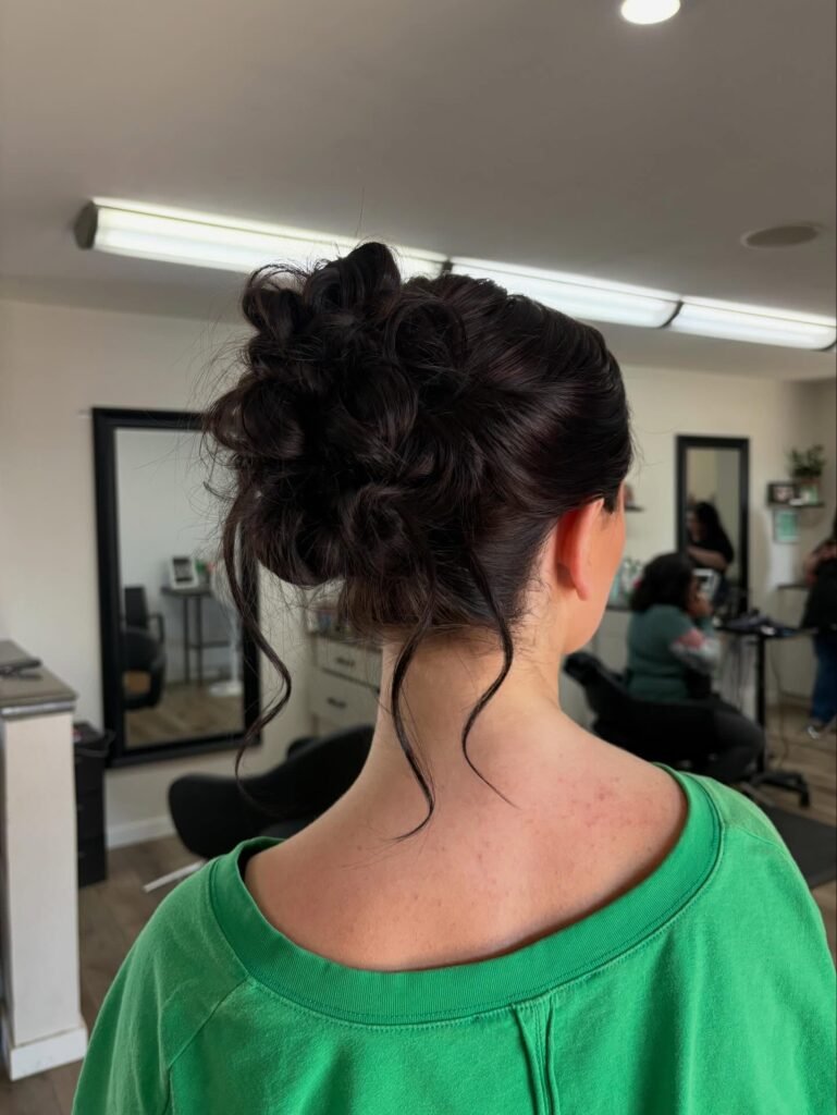 For the girl who loves that perfectly imperfect, messy chic aesthetic, this one is everything. The hair is loosely pulled back with soft volume at the crown and secured into a relaxed, textured bun with wispy strands left out at the nape and around the face for that modern, intentionally undone finish. It is cool, it is effortless, and it pairs beautifully with a more casual or bohemian prom dress. Proof that you do not have to try hard to look absolutely stunning.