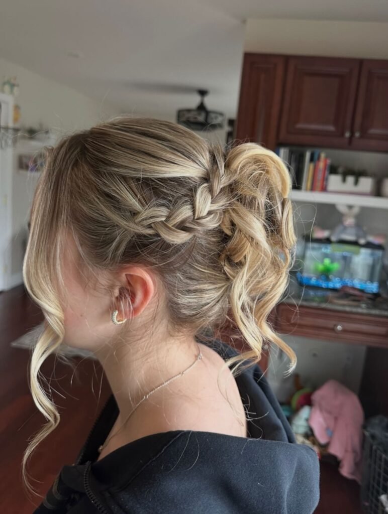 Sporty and elegant in one gorgeous package. A thick French braid wraps around the side of the head and feeds into a high, voluminous ponytail, while the tail itself is styled with loose, beachy waves that give so much beautiful movement on the dance floor. A few wispy strands around the face keep the whole look soft and accessible. It is fun, it is secure, and it is the perfect choice for the girl who wants to dance all night without worrying about her hair for even a second.