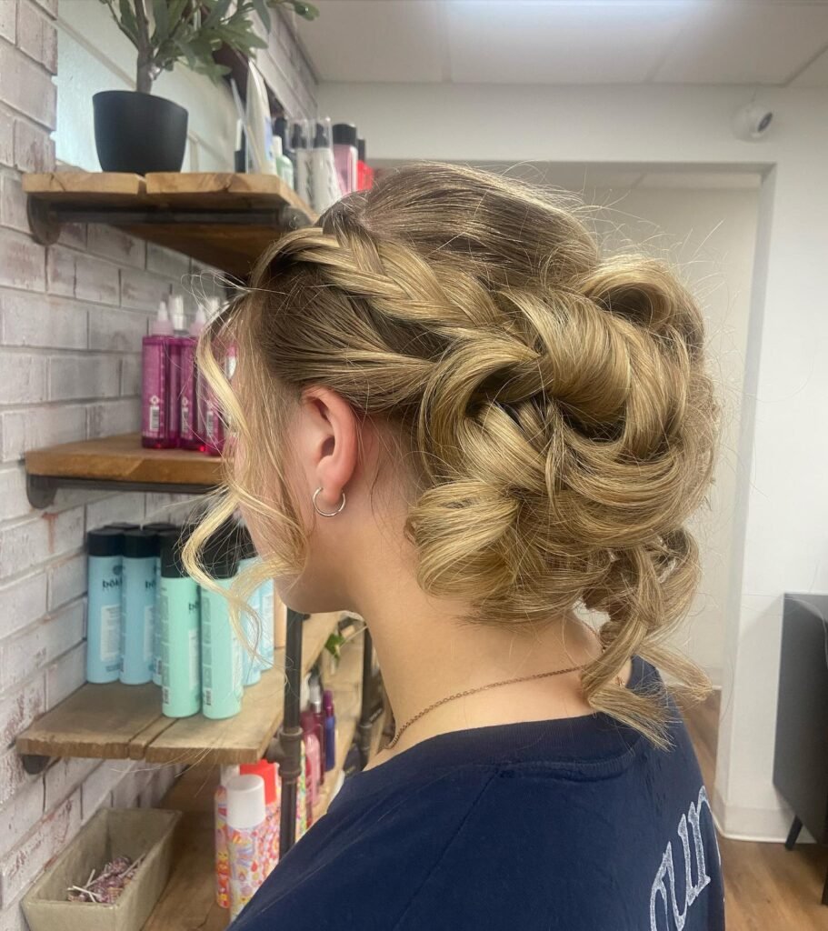 Golden-blonde hair shines so beautifully in this style. Multiple small braids are woven together across the back of the head to create a textured halo effect, while the remaining hair falls into soft, beachy waves below. It is relaxed, it is sophisticated, and it has this gorgeous boho-chic quality that works perfectly for a vintage-inspired or outdoor prom theme. One of those styles that looks like it took a lot of effort but actually feels really natural and easy to wear.