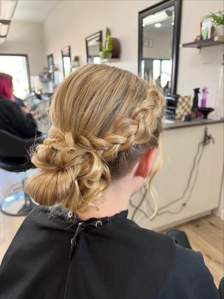 If you need an updo that stays absolutely perfect from the first photo to the very last dance, this is your answer. A sturdy Dutch braid travels from the temple to the back and culminates in a low, textured bun made of soft loops that holds beautifully all night long. It is especially stunning on highlighted blonde hair where the contrast between lights and darks really makes the braid pattern pop. Classic, reliable, and genuinely lovely.