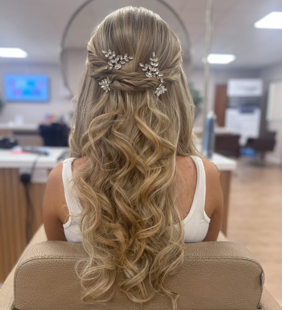 This one takes a beautiful style straight into fairytale territory. A twisted horizontal wrap secures the top section of the hair while the remaining blonde length falls in perfect uniform spirals below, and four sparkling crystal branch pins tucked into the twists add a brilliant shimmer that catches the light from every angle. It is glamorous, it is magical, and it is the kind of hairstyle that makes you feel like you stepped right out of a dream for the night.