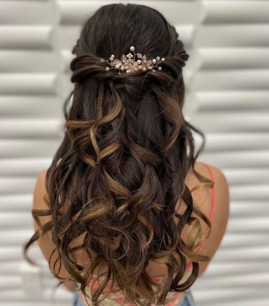 Deep espresso hair with warm honey highlights looks absolutely regal in this style. Voluminous, glossy ringlets flow freely while the top section is pulled back into a soft textured twist and secured with a stunning rose-gold floral headpiece adorned with pearls and crystals. It balances structure and flowing length so beautifully, and the headpiece adds this incredible focal point that elevates the entire look into something truly special and memorable.